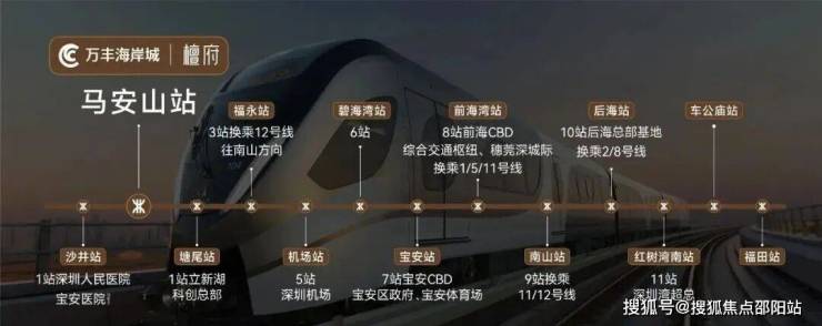 11 号线“马安山站”:D 出口直线距离约 300 米。作为深圳西部的快速轨道,11 号线(5 站)直达宝安机场、宝安中心(7 站)、前海湾(35 分钟)等核心区域,并与 1、2、3、5、6、7、9、12 号线等 8 条线路换乘,半小时可达南山科技园,50 分钟直达福田中心。