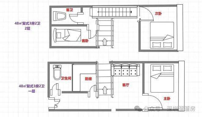 48㎡㎡3房2卫
