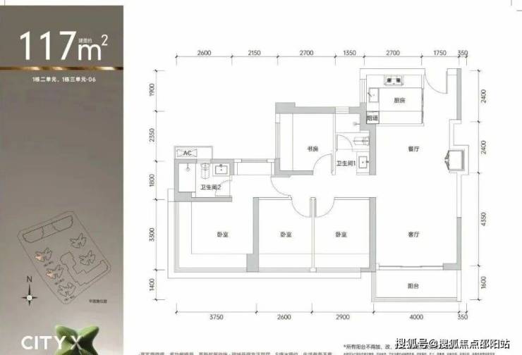 117㎡的4房2厅2卫,1栋2/3单元06户型,400-917-1731设计的是经典竖厅格局,进门入户玄关,客厅4米开间,LDKB一体化,S墙设计预留冰箱卡槽位,四开间朝南,动静分区,4个卧室分别做到了主卧16.5㎡/次卧9.57㎡/次卧8.58㎡/次卧7.97㎡(包含墙体飘窗),U型厨房,公卫三段式分离,得房率约90%(包含赠送),东南或西南朝向。