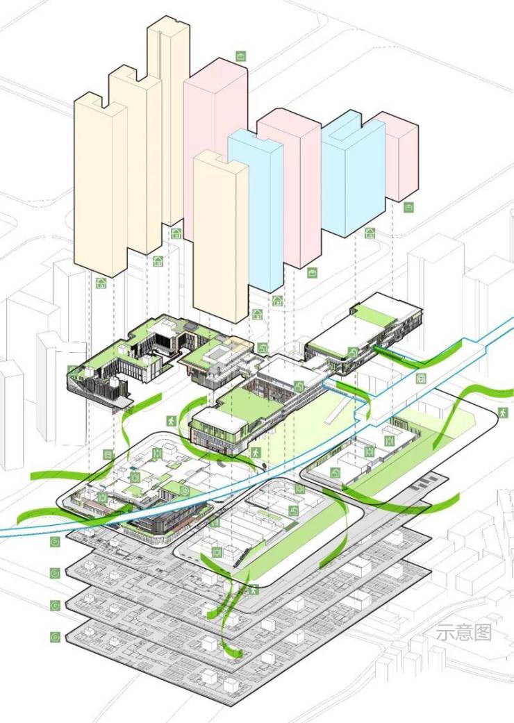 垂直交通场景:多首层设计,空中连板、无风雨连廊等,形成住宅、商业、办公与地面公交、空中地铁的接驳体系。