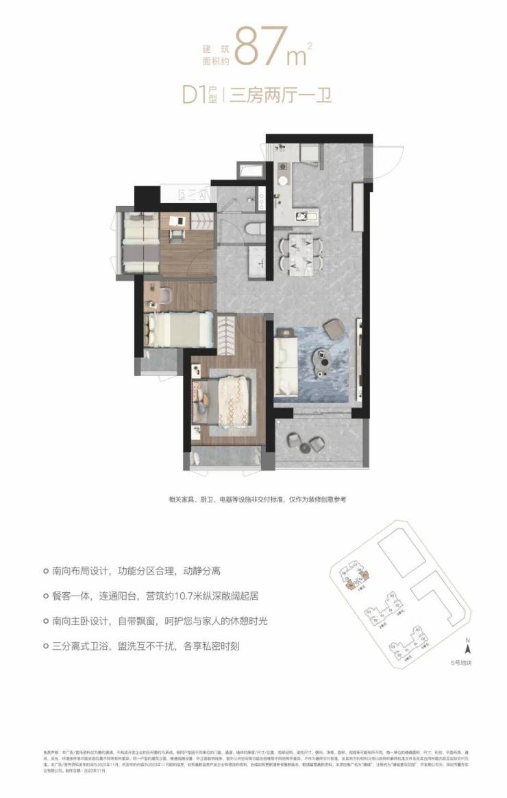 “10.7 m纵深紧凑南向三房”,10.7 m纵深餐客一体,通风采光极佳