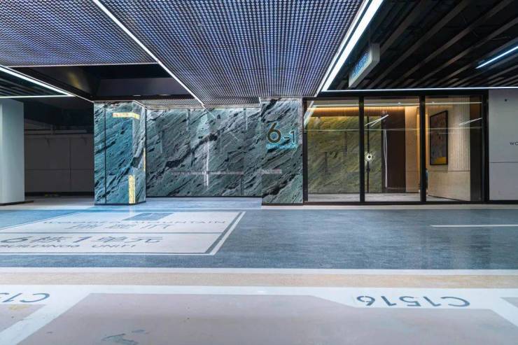 地下车库的车马厅落客区,配置了大面积星空顶作为单元门口示意,甚至连车马厅墙面,都采用了其他项目仅用在客厅背景墙、单方造价5000元/平的巴西进口香格里拉翡翠石材。即便业主从不同入口归家,也能感受到至高的欢迎礼。