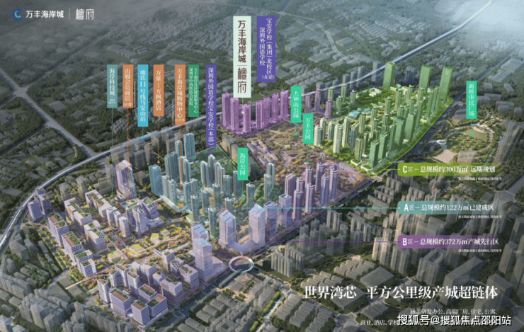 万丰区域整体城市更新项目包含A、B、C三区,合计总建面超500万平,包含商业、住宅、产业、甲级写字楼、高端酒店、学校教育、文化休闲、交通枢纽、生态公园等全维业态。