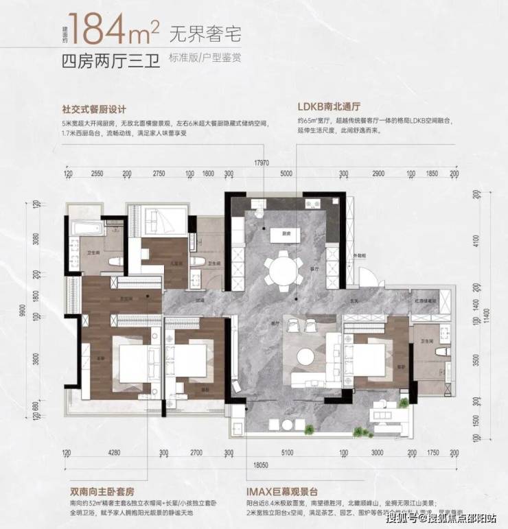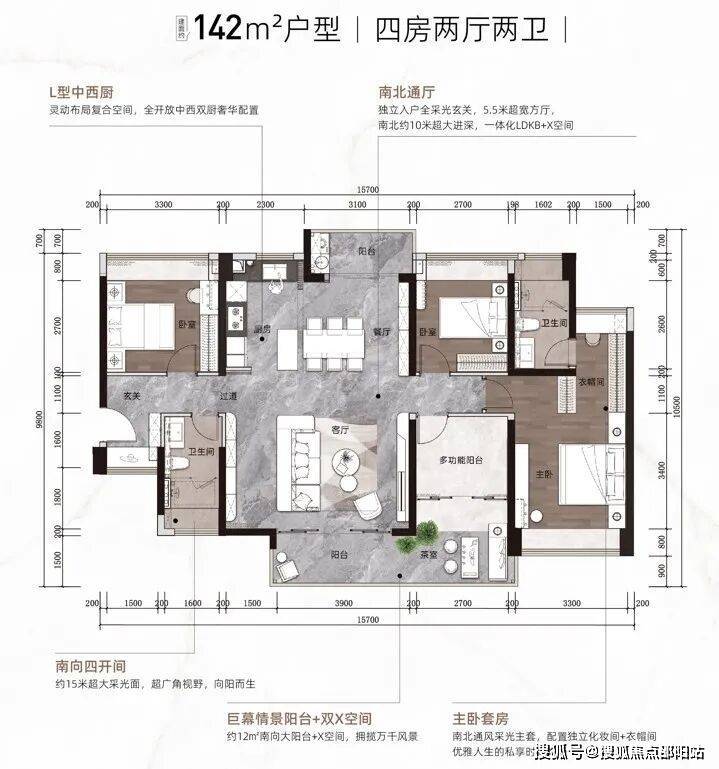 九、【LDKB无界一体化 享受“大平层”尺度】创新”LDKB+X空间”设计理念,客厅、餐厅、厨房、阳台+多功能空间一体化设计,满足家庭休闲、饮宴、社交、会客等功能,探索家的N种可能性,营造打动人心的生活场景。