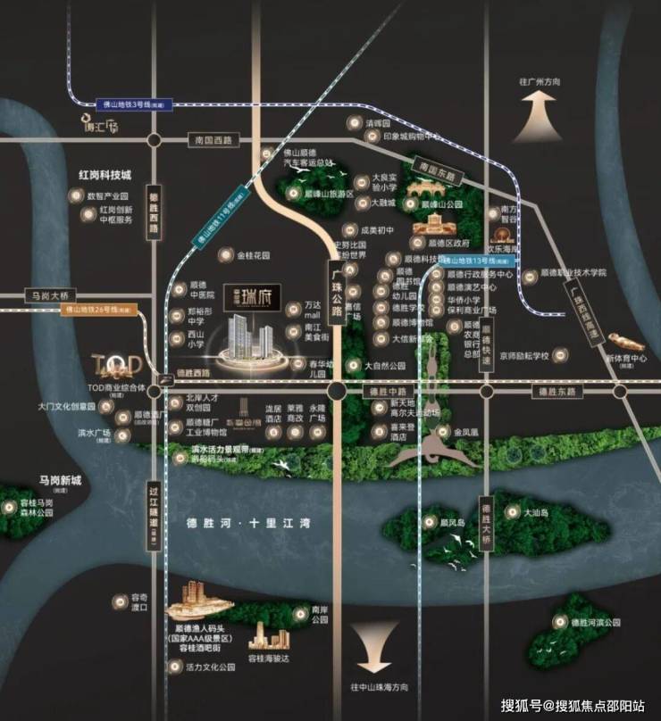 二、【雄踞“德胜河”龙头,坐享千亿资源】鎏金湾·瑞府位于“德胜休闲湾”,正在处容桂水道、德胜河和顺德支流三江交汇成湾,城市规划上占据“顺德推进中心城区八大平台”之三:105黄金走廊(红岗科技城)、顺德工业历史文化带(德胜北岸顺德糖厂活化工程)以及马岗智造新城;与顺德CBD德胜新城紧密连接,形成集科技、人文、行政、商业、生态五位一体,且具备顺德特色的湾式经济圈——顺德湾!