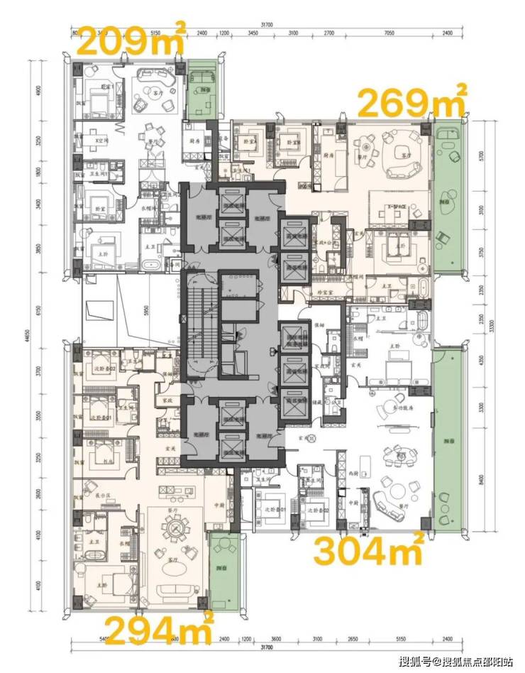 超高区(58层起,200米以上):约500-700㎡顶级大平层。