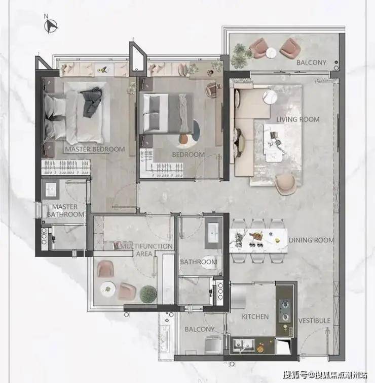 97平户型,最小的起步户型。做了三房设计,相对来说,各空间都不小。入门门槛友好,不过次卧采光一般。