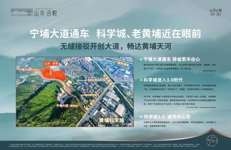 从项目出发,经宁埔大道接驳开创大道,5分钟科学城20分钟达萝岗万达、至泰广场、香雪城三大商圈;经广园快速、广深高速,30分钟快速直达天河