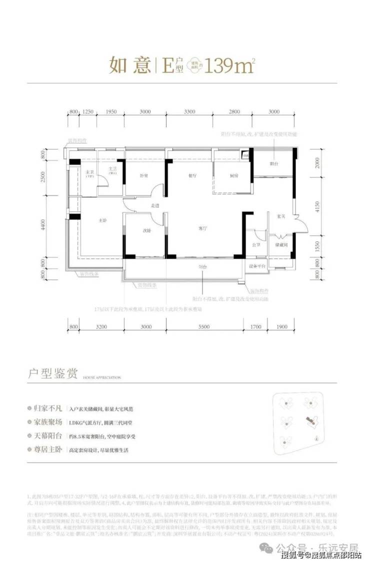 139㎡的4+1房2厅2卫,设计的是竖厅南北通透格局,进门赠送约5.2㎡的入户玄关(不计算在户型图内),客厅5.5米开间,LDKB一体化方厅设计,5个卧室分别做到了主卧27.56㎡/次卧10.2m²/次卧9.9㎡/次卧9.9㎡/次卧4.46m²(包含墙体飘窗),L型厨房,得房率约81%(不含赠送),客厅连接次卧出13.6m²的观景大阳台,主朝西南向。套内面积112.59m²+赠送面积31.98m²=实际使用面积144.57m²,加上赠送后得房率约104.01%。