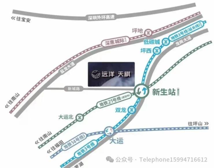 交通配套:距离地铁3号线东延线(在建中,预计2025年通车)和21号快线(规划中)双轨交汇“新生站”(建设中)直线距离仅约500米(百度地图测距),是片区离地铁最近的在售项目,未来还有深惠城际前海保税区至坪地段,全长58公里,时速160公里/小时,以后从项目到南山、前海也很方便快捷。