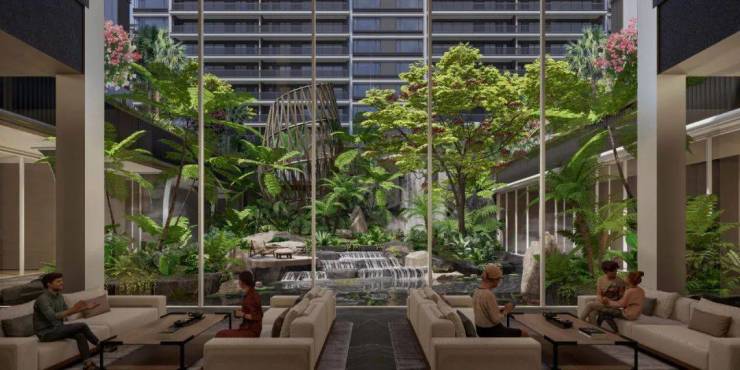 ZSD卓时、北京大象共同担纲园林设计,以国际前沿审美,再造城芯理想栖息地。在「云栖里」组团园林设计中,汲取在地旅居灵感,打造五维度假园林场域,实现“听海浪启航,触海岸礁石、观波澜粼影、闻森屿气息、感度假生活”的旅居体验。园林布局呈献“一轴六境”,以星级酒店迎宾门廊、热带雨林中庭、“漂浮盒子”地下会所铺陈归家礼仪秩序,兼具观赏与社交功能,营造独具魅力的热带风情园林。