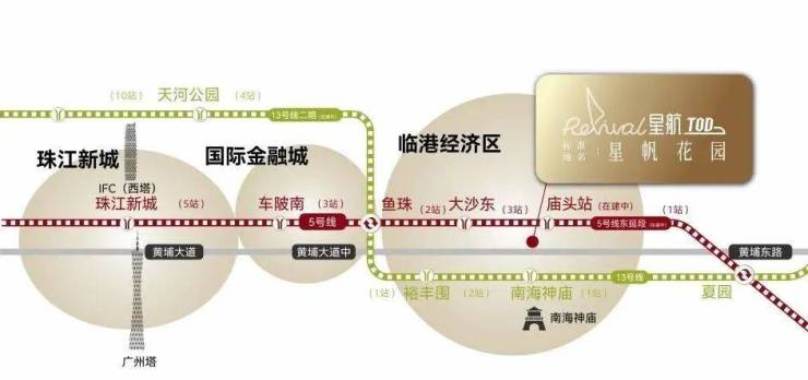 ·13号线南海神庙站(步行约500米,7分钟可到达,已通车)为邻一条黄埔大道贯通第二CBD经济核心地带,13号线二期建设中(预计2024年建成开通)未来串联白云、天河、黄埔和增城四区;