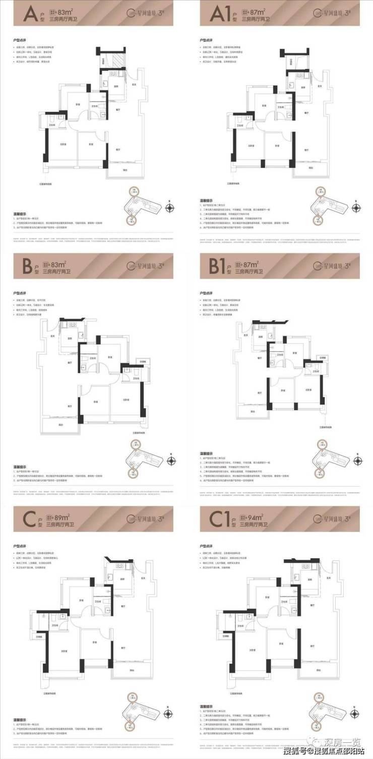 户型最大的亮点在于83平米的3房,能拥有2个卫生间,3代同堂居住更为舒适;下面是楼栋分布和户型图: