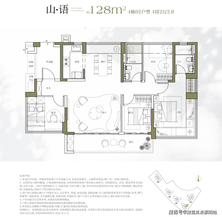 128㎡的4房2厅2卫:设计的是横厅南北通透格局,进门独立入户走廊全赠送,客餐厅分离化设计,横厅大客厅+功能间,五开间朝南,主卧270°无柱转角飘窗+1个次卧朝南,2个次卧朝北向,U型厨房,卫生间干湿分离,得房率约:100%(包含赠送),西南或东南朝向。