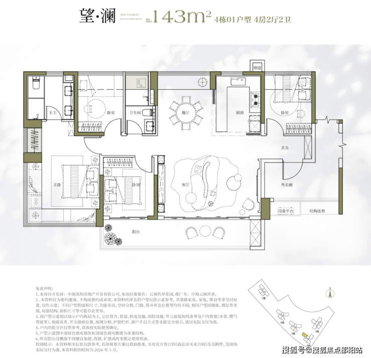 143㎡的4房2厅2卫:设计的是横厅南北通透格局,进门独立入户走廊全赠送,客餐厅分离化设计,横厅大客厅+功能间,五开间朝南,主卧270°无柱转角飘窗+1个次卧朝南,2个次卧朝北向,U型厨房,卫生间干湿分离,得房率约:100%(包含赠送),西南或正南朝向。