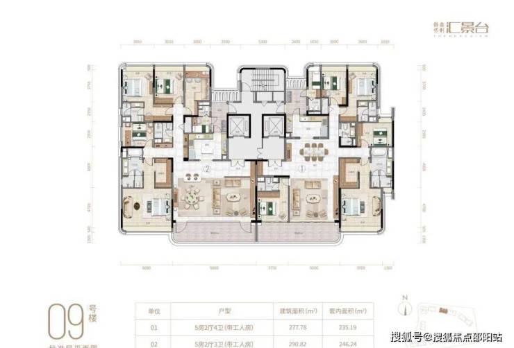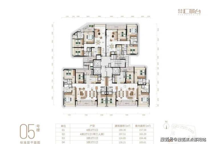 项目由14栋12层小高层组成,产品涵盖123-352㎡三至五房,共8类户型,户型实用率约82-84%