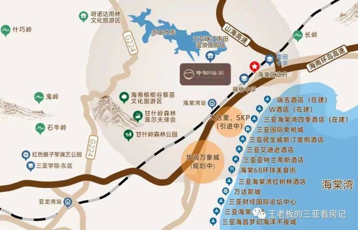 海棠湾是海南唯一一个由国家规划打造的度假湾区,定位为国家海岸,22公里海岸线汇聚千亿配套,32家超五星级酒店、4大主题乐园、5大高尔夫球场、310解放军医院海南分院、亚洲最大单体免税店、华润超级万象城、北京华联SKP等资源环伺。中御海棠项目位于海棠湾南田片区,坐享东线高速、山海高速、机场、高铁、城际公交等三维立体交通网,度假生活出行四通八达。