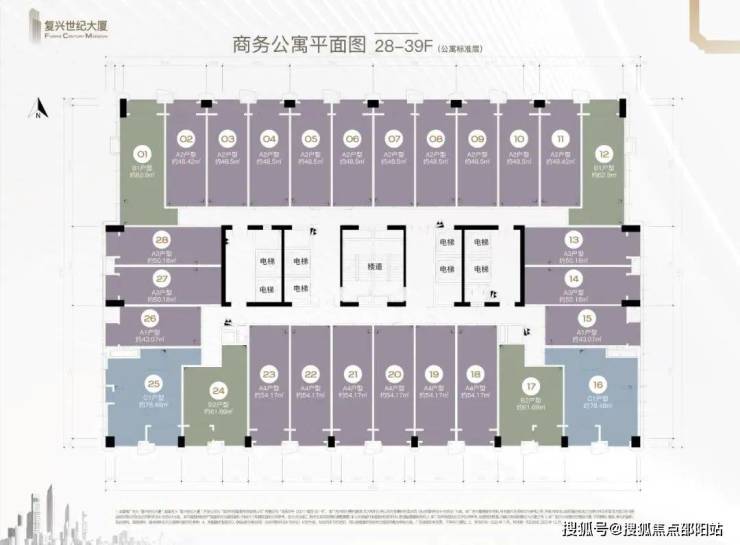 公寓8梯28户,办公6梯15户,商业4梯34户