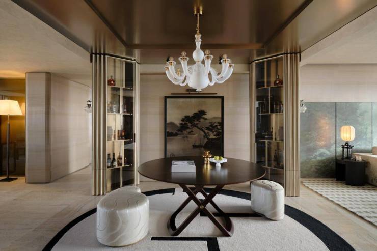 Armani Casa的设计将水墨刺绣融入到居室中,巧妙地布局,描绘着举杯谈笑、雅士风度的迎客之道。