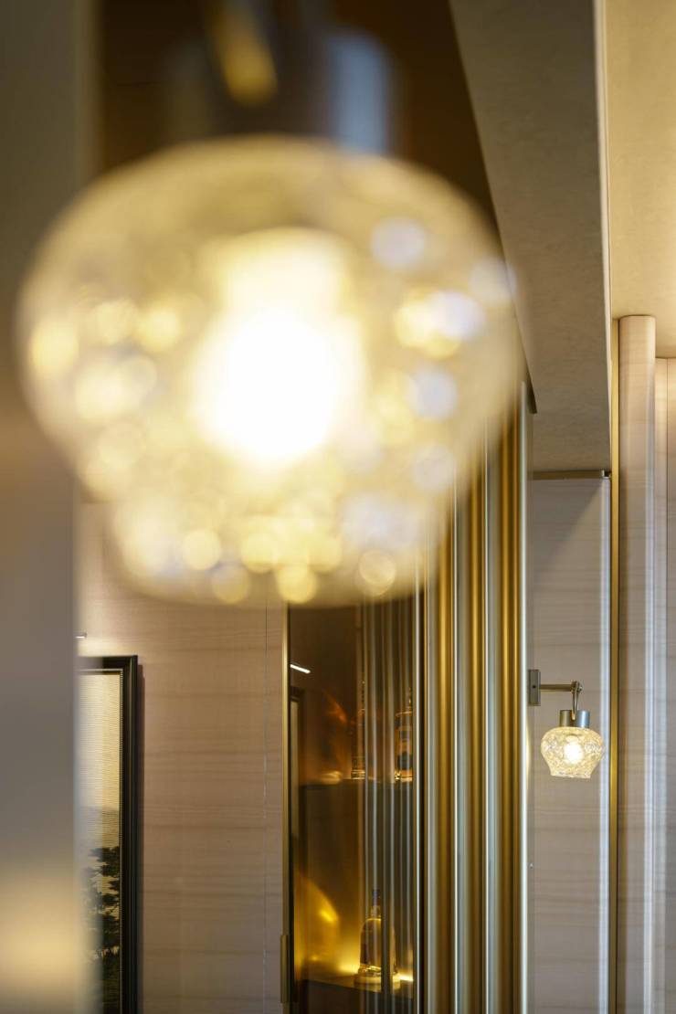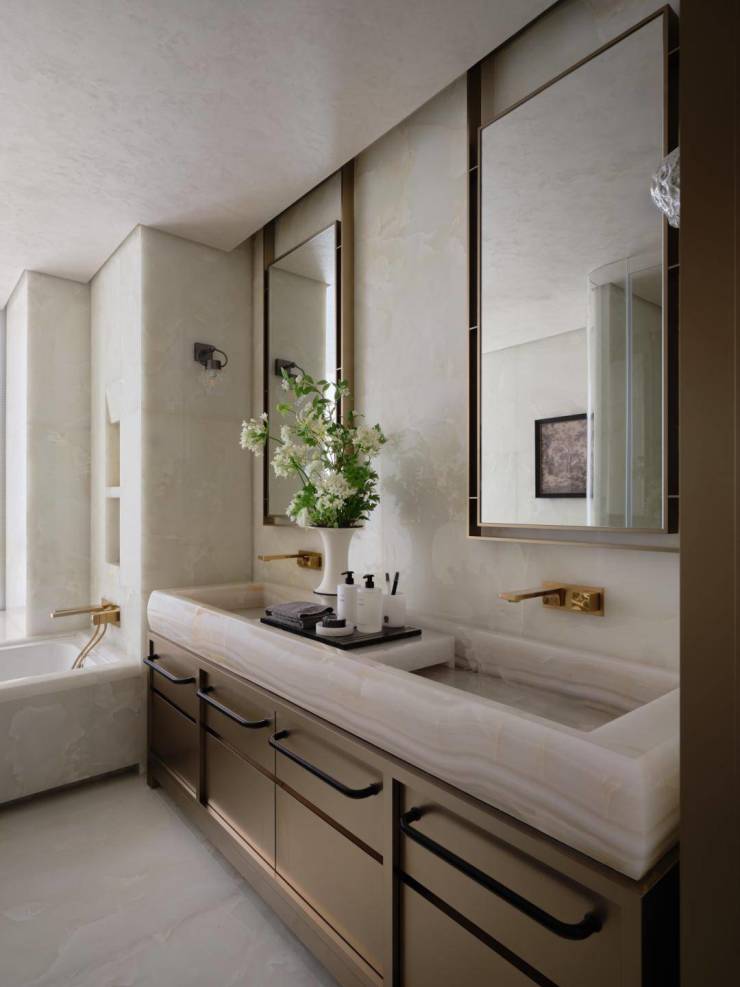 清水玉地面贯穿室内空间,半吨重白玉洗手台整体打磨,使其呈现出淡雅的色泽和岁月的润泽。