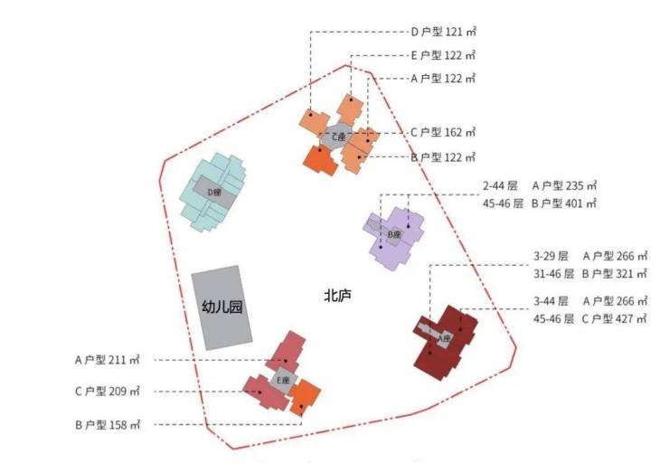 北庐住宅户型:建面约210㎡、235㎡、266㎡、322㎡,410-470㎡(顶复)