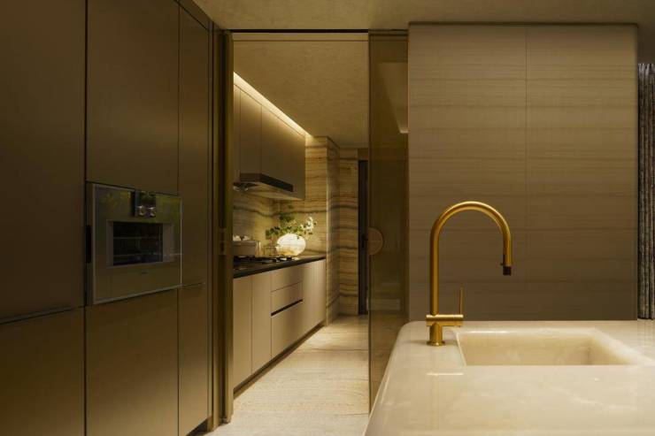材质多样的天然大理石与Armani Casa珍贵织绣墙面,刚柔同韵在自然肌理,平衡着细腻、丰富的感觉体验,彰显典雅奢华气质。
