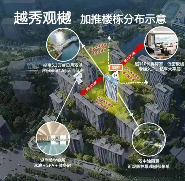 最近直线距离湖仅约40米,坐拥约300米瞰湖岸线,可观可亲可玩,比起泛湖片区的楼盘赢了一大截。
