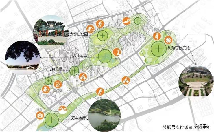 以新桥市民广场、大钟山,石岩渠、万丰水库。立新水库等绿色生态资源为基础搭建”生态绿环+城市绿芯”生态色框架,打造“线性公园”+“节点公园”公共开放空间体系,形成10公里生态绿环创造了片区居民多样化的居住休憩生活方式。