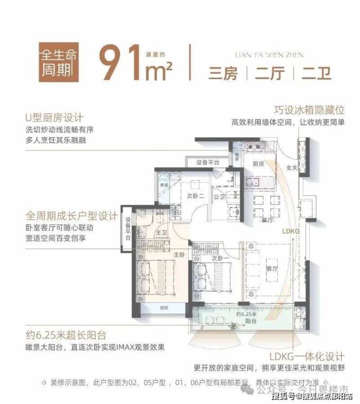 ③91㎡户型拥享约6.25米南向超长阳台,创变LDKG一体化设计,满足青年家庭成长需求