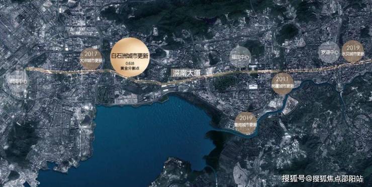 在伦敦、纽约这样的超级城市,其城市主轴的黄金分割点上均屹立着城市超级影响力的项目,如伦敦金丝雀码头、纽约中央公园,而深圳的发展主轴深南大道自东向西,绿景白石洲正处于黄金分割点之上。项目位处城市GDP第一的南山区,深南大道与大沙河科创走廊十字交汇点,代言深圳发展高度。
