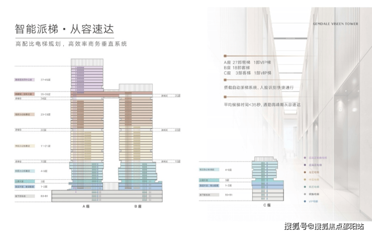 电梯数量:A座27部客梯,1部VIP梯,B座18部客梯,C座3部客梯、1部VIP梯(通力)