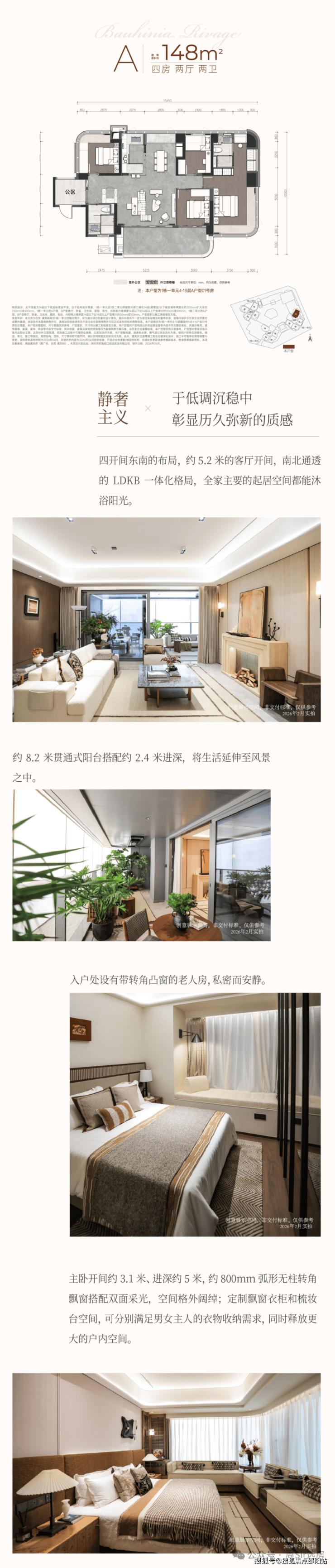 148㎡的4房2厅2卫,设计的是横厅南北通透格局,宽敞入户前门厅,3梯4户,客厅5.22米开间,客餐厅分离化设计,四开间朝南,奢阔主卧,270°无柱转角大飘窗,分别做到了主卧30.5㎡/次卧13.23㎡/次卧10.05㎡/次卧9.64㎡(包含墙体飘窗),U型厨房,公卫三段式干湿分离,得房率约100%(包含赠送),客厅连接次卧出19.74㎡的大阳台,长8.22米,西南或东南朝向。