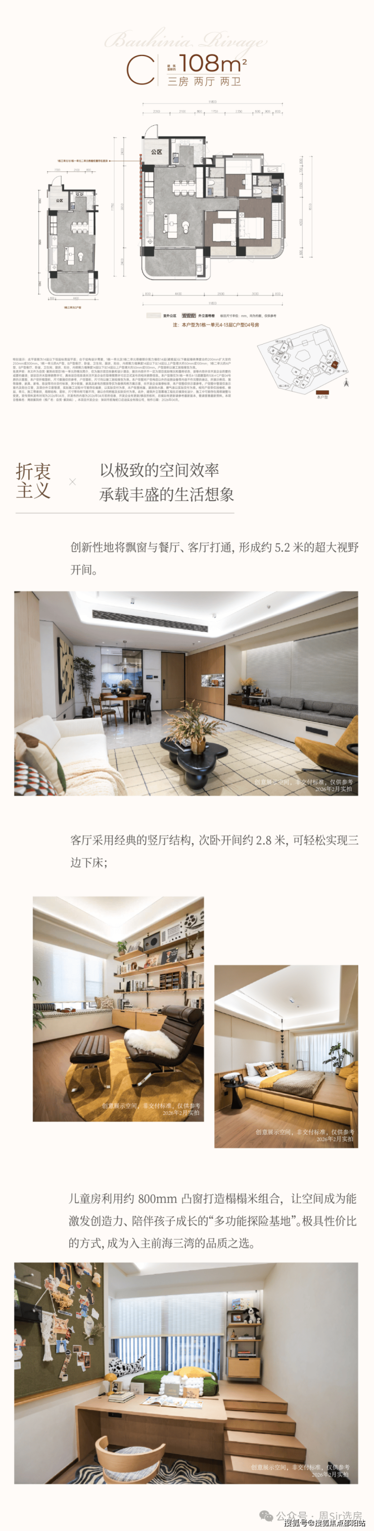 108㎡的3房2厅2卫,设计的是竖厅格局,宽敞入户前门厅,3梯4户,客厅5.2米开间,LDKB一体化设计,三开间朝南,动静分区,270°无柱转角大飘窗,分别做到了主卧19.38㎡/次卧11.2㎡/次卧9.3㎡(包含墙体飘窗),U型厨房,卫生间干湿分离,得房率约100%(包含赠送),阳台约12.48㎡西南或东南朝向。