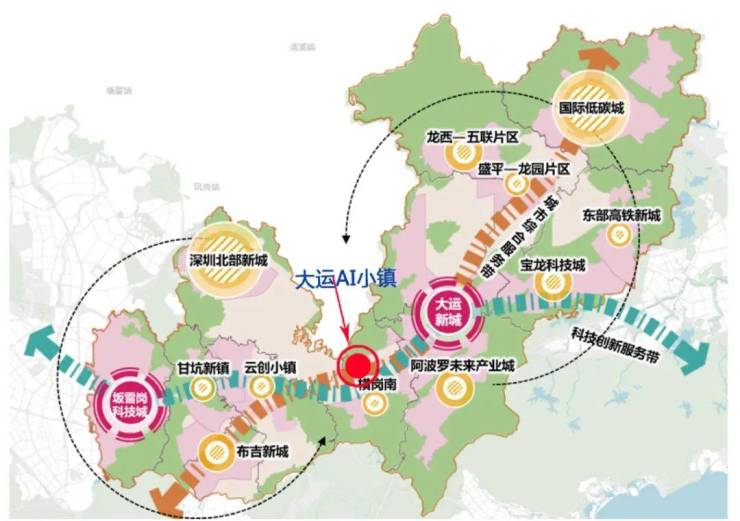 通过围绕“一芯”“两核”“多支点”主体功能布局。大运新城作为“一芯”的代表,位居“东进战略”最前沿,也是粤港澳大湾区经济腹地、辐射粤东北的“桥头堡” ,打造深圳都市圈的“东核心”。