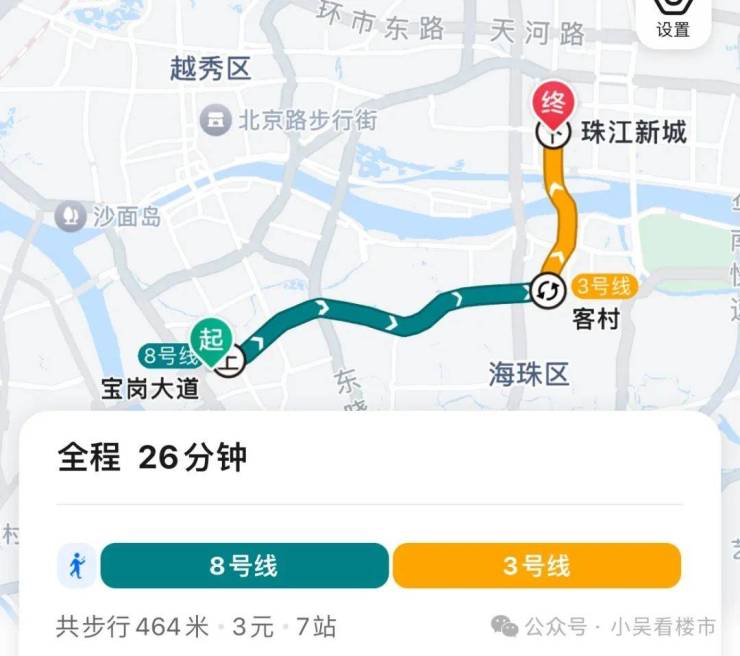 地铁去往珠江新城:乘坐8号线5个站到客村换乘3号线,再到珠城,全程7个站,耗时26分钟左右。