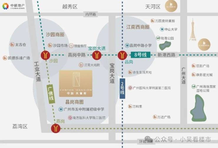 从项目出发10分钟内,可到达昌岗、江南西、中大、沙园四大商圈,项目朝北走几百米就是沙园市场,900米处就是凯德乐峰广场,周边还有京东MALL、广百新一城、富力海珠城等商业,住在这里的生活真是多姿多彩,商业配套非常齐全。