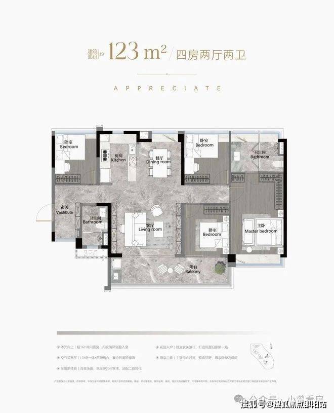 建面123平四房两卫,南北对流户型,LDKB一体化设计,约7米长景观阳台,主卧设置L型衣帽间,三个次卧差不多大小,转角玄关用作收纳。