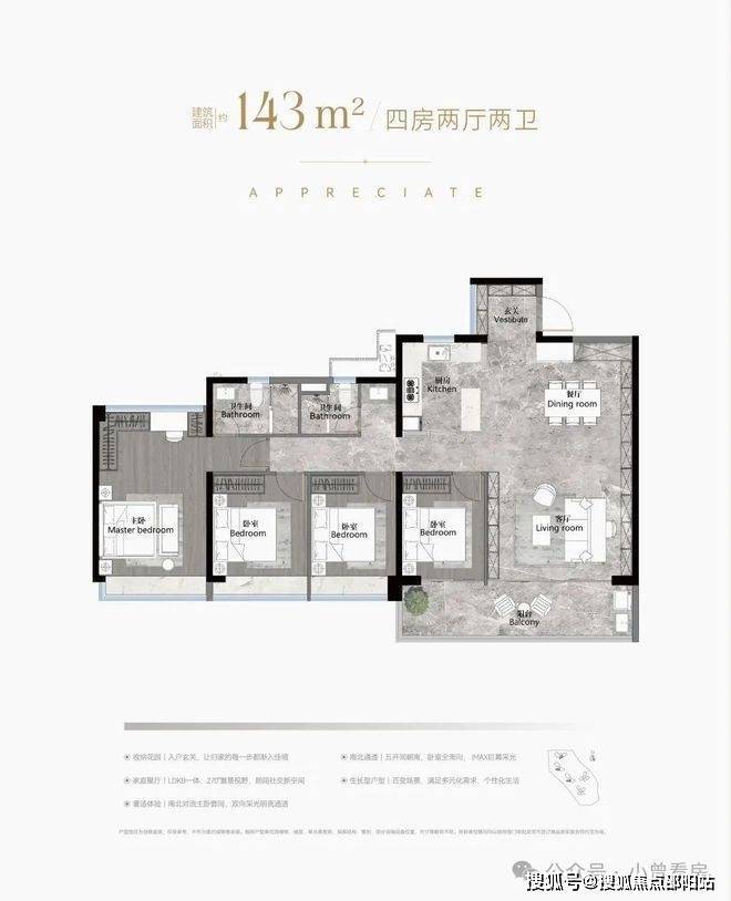 建面168平四房三卫,放大版的142平,做了双主套,适合三代同堂家庭,单边位,南北对流采光通风都非常好,约40平的大房厅,景观阳台开间约8.2米.