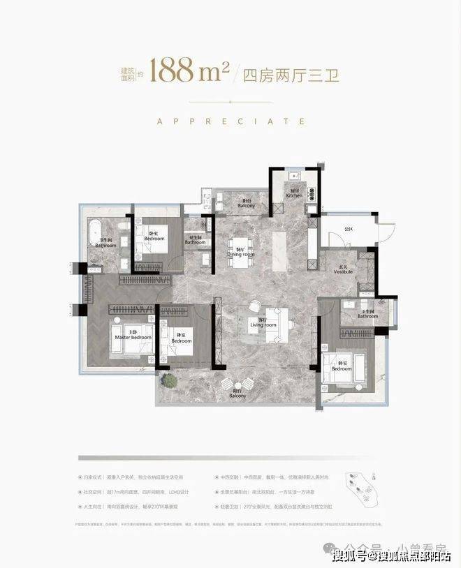 建面188平四房三卫,据说使用率超110%,双主套分居两侧,三代同堂的话,可以很好地避免两代人不同的休息时间干扰互相,入户独立玄关为还有宽裕的储蓄空间,能安置酒柜等,更有南北对流双阳台+中西双厨,主卧超宽三面采光等,不愧是终极改善不二之选,9米长跑道阳台,约34平豪华主卧,270度环幕飘窗