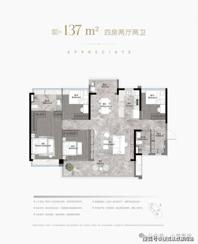 建面137平四房两卫,带入户花园,南北对流,大客厅+LKDB设计,主卧套房,同样也可以对流。