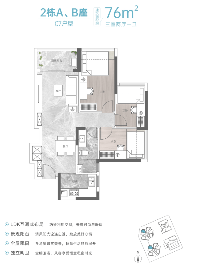 ③建面约76㎡是竖厅三房两厅一卫户型,结构比较传统,功能间布局合理,实用性比较强,比较适合预算有限的刚需家庭,预计这个户型会比较抢手。