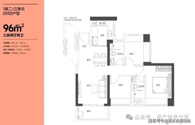 95㎡的3房2厅2卫,设计的是竖厅格局,LKDB一体化设计,进门入户玄关,有1个次卧做的双飘窗,U型厨房,卫生间三段式分离,得房率:74.34%(不含赠送),全部东南朝向。