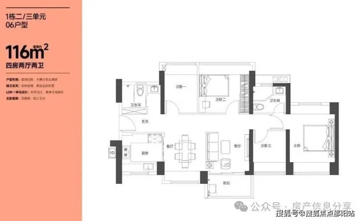 116㎡的4房2厅2卫,设计的是横厅南北通透格局,LKDB一体化设计,进门入户玄关,五开间朝南,超大宽面,主卧南北通设计,U型厨房,得房率:74.35%(不含赠送),阳台主朝东南向。