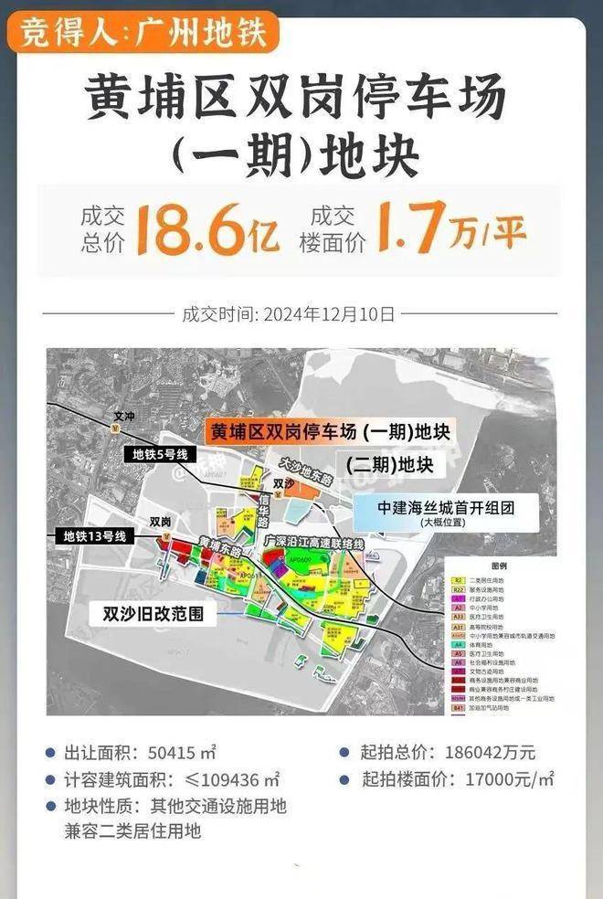2024年12月10日,黄埔双岗停车场地块一期正式竞价,广州地铁以底价186042万元拿下,成交楼面价约1.7万/平。