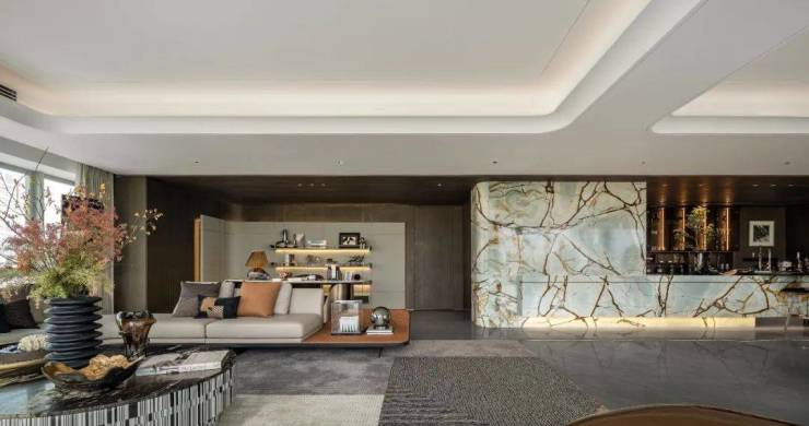 超长面宽的艺术奢石与深色木质结构的结合,将吧台与餐厅空间分隔,形成相互照应而又互不干扰的格局,映衬着温暖轻盈的光影,方寸之间,皆是静雅的无尽韵味。多功能吧台与中西厨料理区的结合,激活空间的多元需求。线条与材质,共筑雅奢生活的精致范本。
