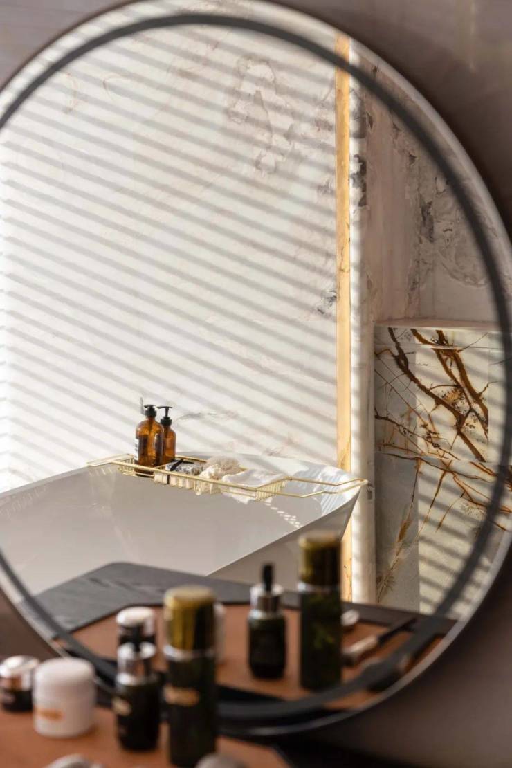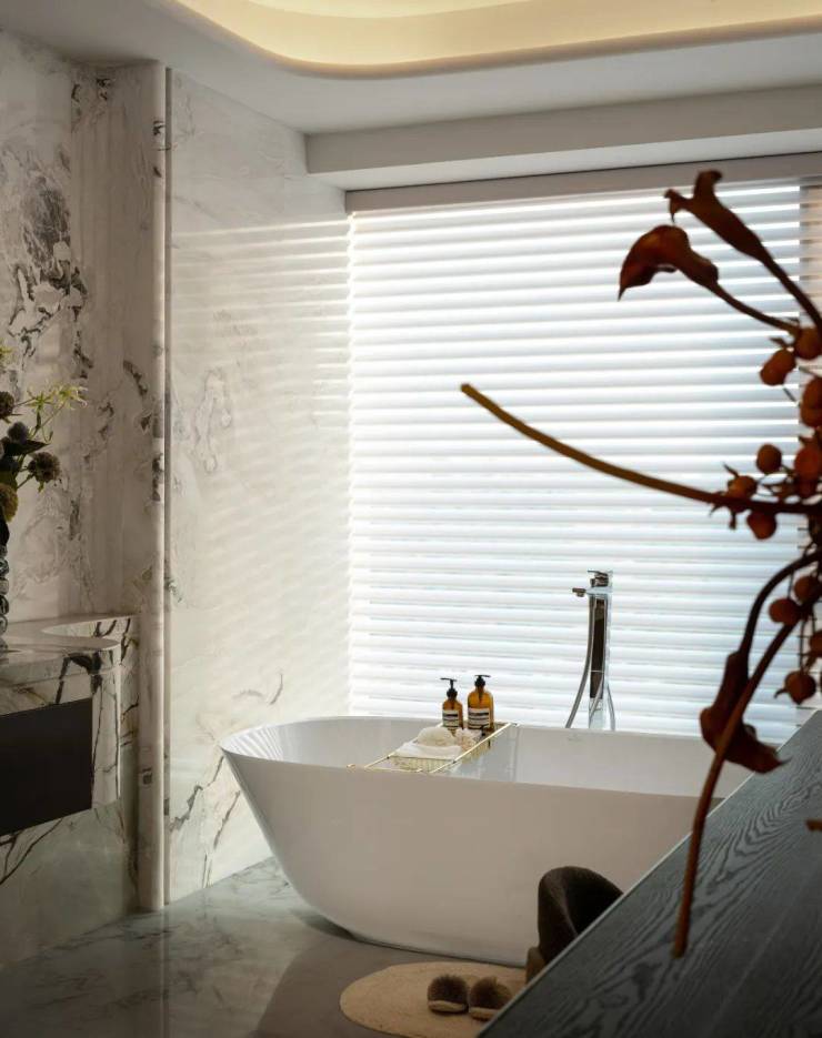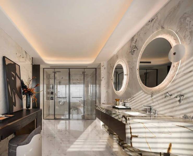 主卧卫生间以21m²奢阔的大尺度赋予了奢华酒店的舒适体验感,整体墙地面采用天然纹理的奢石打造,2.6米超长台面,为男女主人打造更具舒适与便利的功能空间,超宽浴室搭配全景窗台,面朝东莞CBD中央公园景致的主卧浴缸,以充满仪式感和私密性的设计,让沐浴变成一次洗涤身心的奢华之旅。