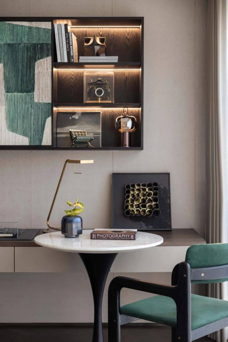 书房作为主人放松与休闲的空间,以半围合的布局,与客厅形成连通。精致的金属展示柜映衬着暖意的灯光,为珍藏的艺术品赋予独特的魅力,大理石书桌搭配古铜色几何造型桌脚,每一处细节都在述说着自信优雅的生活格调,诠释出主人忠于自我的精神世界。