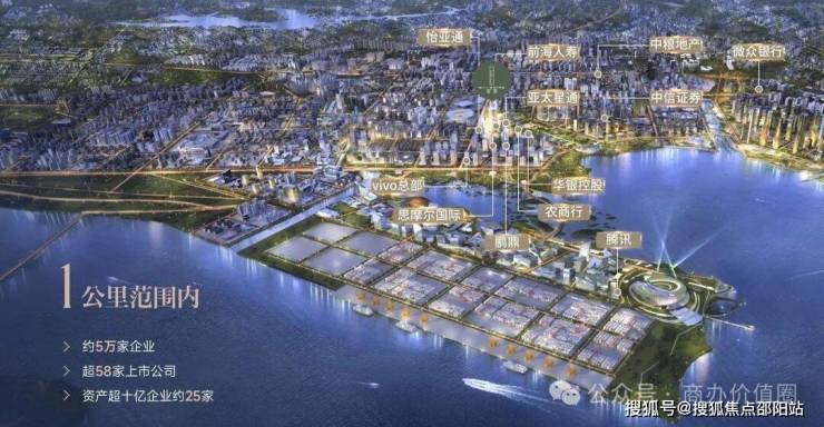 4.前海湾中轴之核,湾区超强总部经济区:项目1公里范围内约5万家高新企业,超60家上市公司,腾讯、前海人寿、VIVO总部等名企林立,资产超10亿企业约25家