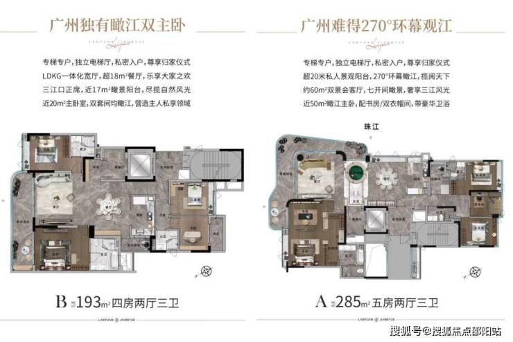 户型设计挺有亮点的,比如专梯专户、望江双主卧、270°江景阳台等。