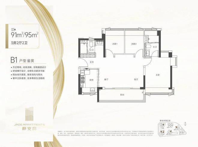 建面约91/95㎡产品为3房2厅2卫设计,户型更为方正,采用横厅设计,南北通透,采光、通风性能优异,空间也更加舒展。